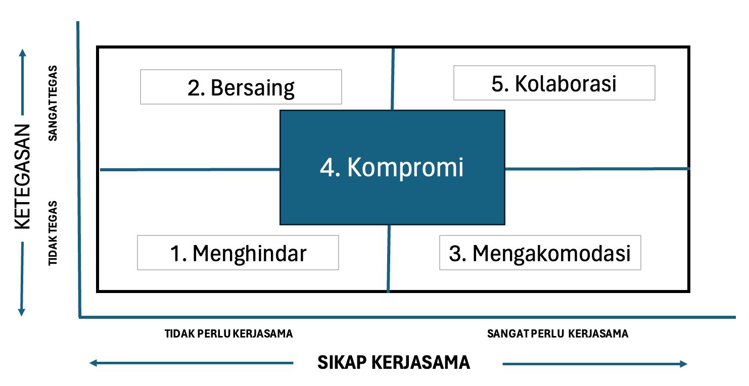 Ada lima strategi dalam menyelesaikan konflik (lihat gambar di bawah).